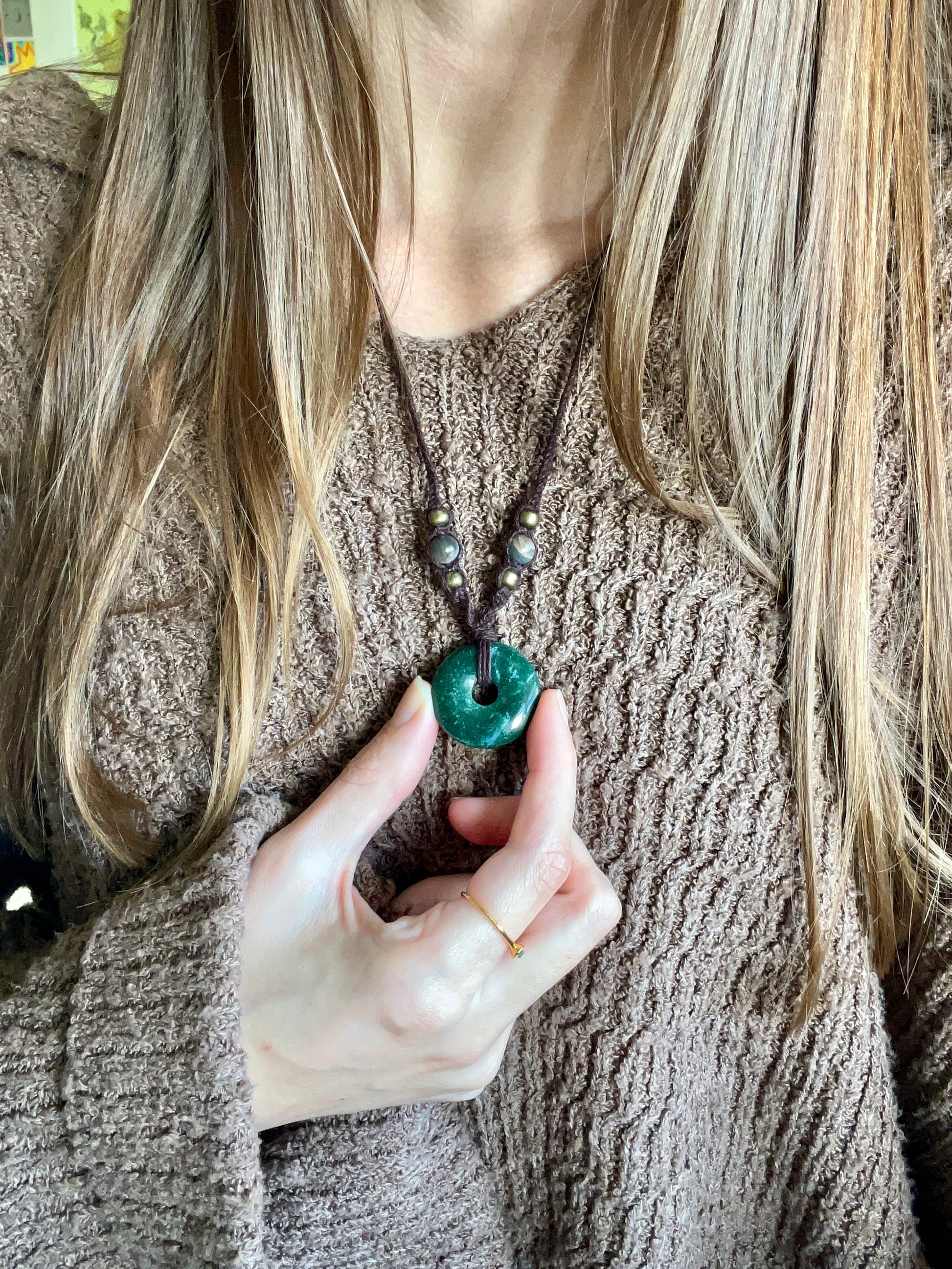 Handmade Macramé Green Moss Agate Doughnut crystal necklace with brass and Black Moonstone beads ₊ ⊹